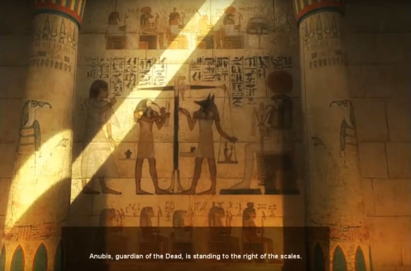 A scene from the game where the player enters a mausoleum and uses a ‘Weighing of the Heart’ ceremony relief to help solve a puzzle (Screenshot by author)