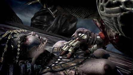 Screenshot of cutscene where Dante kills the Kleopatra boss in Dante’s Inferno (Screenshot from Infernopedia: https://static.wikia.nocookie.net/dantesinferno/images/a/a0/Cleopatra_and_Dante.jpg/revision/latest?cb=20111029033720)