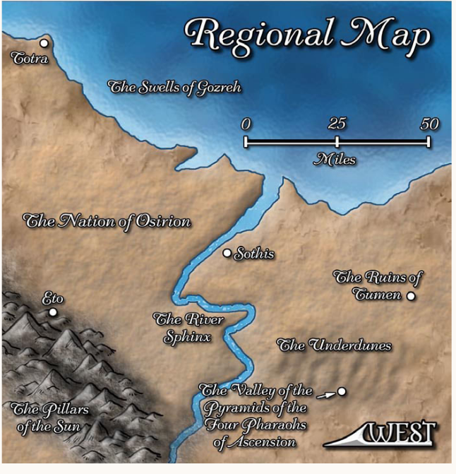 Entombed with the Pharaohs is an adventure RPG for four level 6 characters in the Pathfinder game system (derived from D&D). In this adventure, the players find themselves in the city of Sothis in the lands of Osirion, which is a sort of transcript of ancient Egypt at the time of the pyramids. The players' mission is to participate in an auction and contact the Pathfinder agents, an association of adventurers, cartographers, and treasure hunters, who will assign them a new mission.