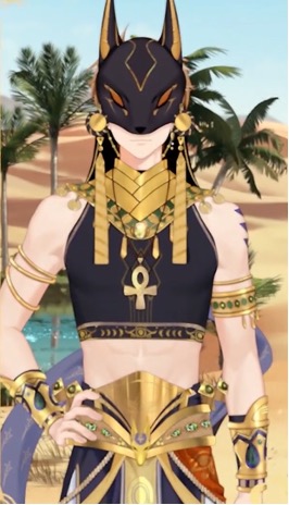 One of the male leads, Luke, ft. an Egyptianising outfit with a mask of Anubis and an ankh necklace (Screenshot by the author)