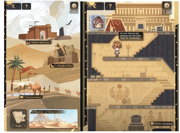 In 2022, Tears of Themis released a limited event, called “Secrets of the Tomb”, in which the main cast travels to a desert land called “Khaimit”, a term that closely resembles Kemet, the Egyptian name for Egypt. The events contain different phases that allude to both orientalist portrayals of modern Egypt (such as the museum or the bazaar/market) and ancient Egypt (such as the tomb of Ita or the Pyramid-like building called “Shadows of the Resurrection”). In these ancient Egyptian locations, players can explore an Egyptianising tomb and pyramid to dig up materials and beat challenges to earn rewards for the event. While exploring these locations, players can get both buffs and debuffs that affect their gameplay, and they all allude to Egyptian gods and their functions (such as “Isis’ Protection”, “Osiris’ Judgement”, “Nun’s Abyss”, “Ptah’s Artistry”, or “Apophis’ destruction”).