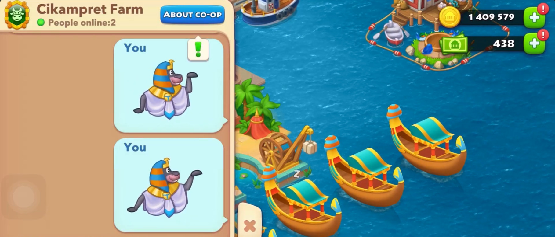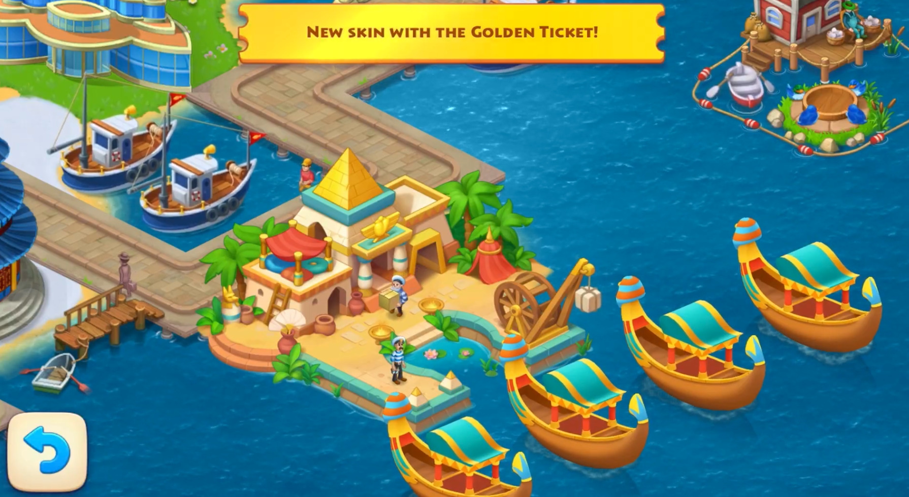 The game introduced a seasonal event named "Egypt Adventure" in November 2024, with an ancient Egyptian theme. As with other seasonal events, players gathered points by completing various tasks, which were then converted into rewards beneficial for expanding their town. While the tasks were not directly linked to ancient Egypt, the event’s graphics, and some rewards, including skins, were thematically consistent. The event specifically allowed players to dress their sheep in an ancient Egyptian outfit and acquire unique attire for their boats and port. These cosmetic designs integrated classic pop-cultural aspects of ancient Egypt: a nemes-style headpiece and a scarab-adorned collar for the sheep; a barge-shaped boat with a kiosk resembling a shrine; and a pyramid-shaped port whose entrance was decorated with a winged scarab. Additionally, the colors were crucial in evoking ancient Egypt, with a significant use of yellow and blue (likely to recall gold and Egyptian blue, and, especially, the colors of Tutankhamun’s funerary mask) helping viewers immediately associate the quest items with ancient Egypt.