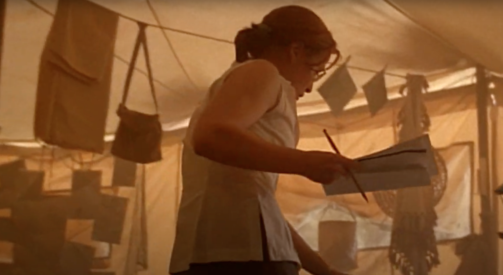 Dana Scully is studying in a tent reminiscent of the imagery of archaeological dig workspaces in films (Screenshot by the author)